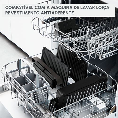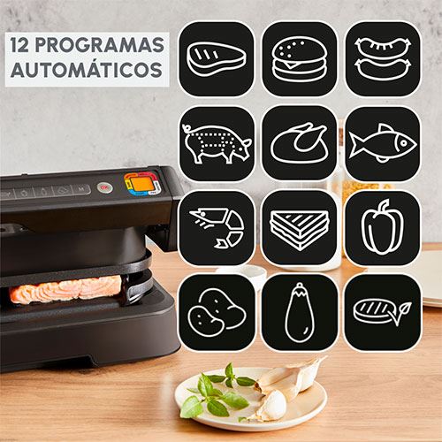 Placas | Gaveta de recolha de sucos | acessório baking | Funções: Carne vermelha, Hambúrgueres, salsichas, carne de porco, carnes brancas, peixe, marisco, sanduíches, legumes, pimentos, beringelas e batatas | Modo cozedura para ingredientes congelados | Posição barbecue | Luz piloto - pronto a utilizar | Receitas incluídas
