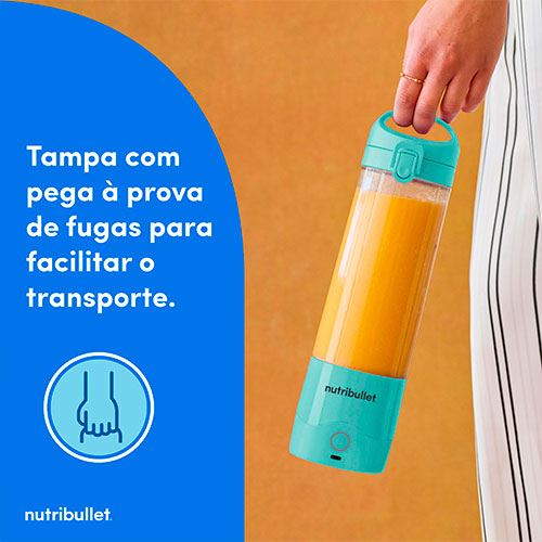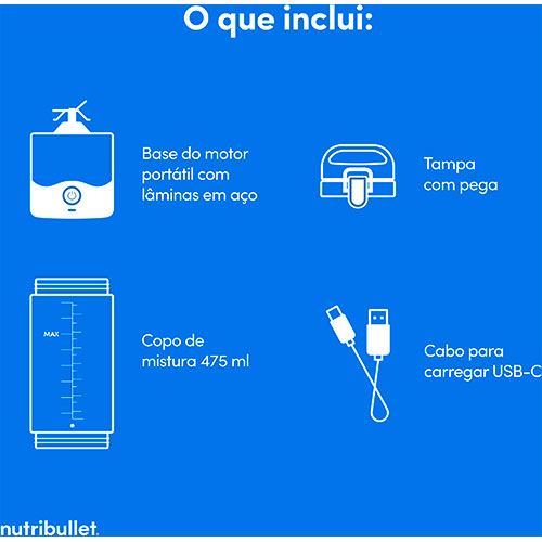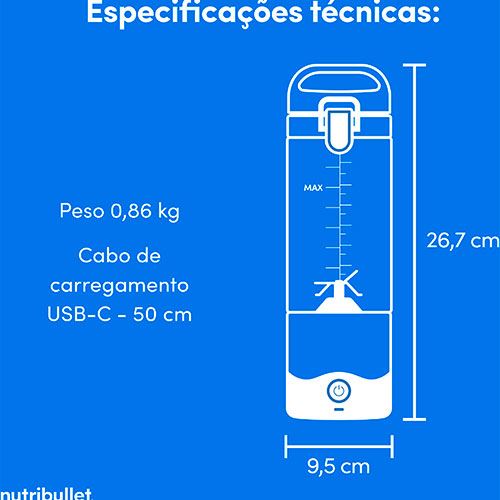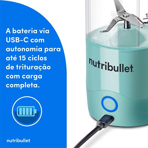 Outras Informações Capacidade da Bateria: 2000mAh | Copo e tampa em plástico Tritan™ BPA-free | Carrega via USB - autonomia máxima para até 15 ciclos de trituração automática (20 seg.).