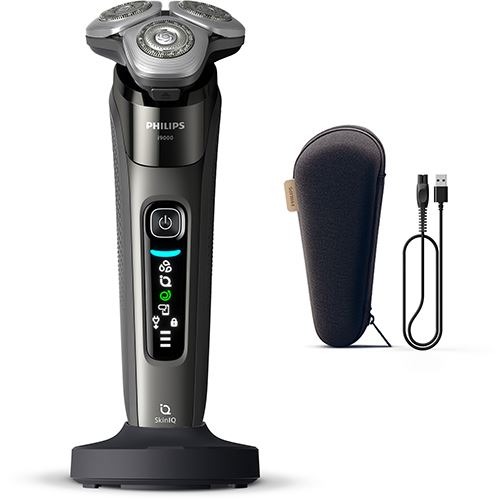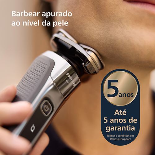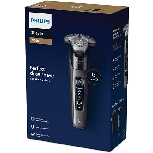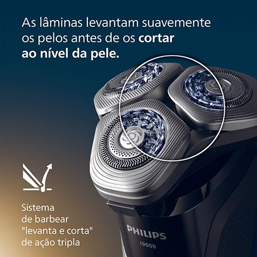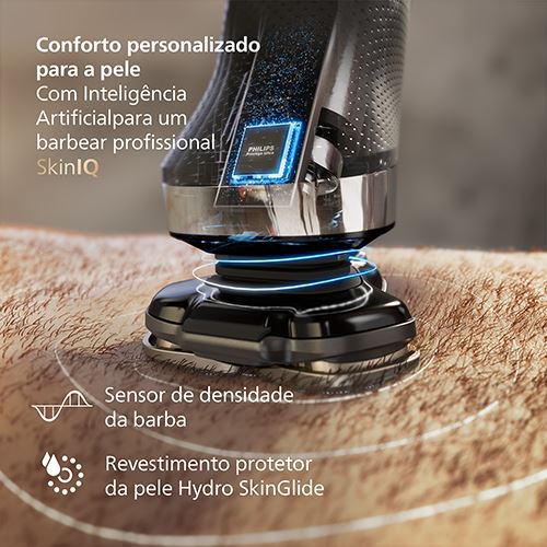 A Philips i9000 proporciona um barbear próximo da pele com o seu sistema Lift & Cut de tripla ação e cabeças flexíveis compactas de 360°, mesmo em zonas difíceis de alcançar. A tecnologia SkinIQ com IA deteta e adapta-se à sua pele para o máximo conforto e precisão.