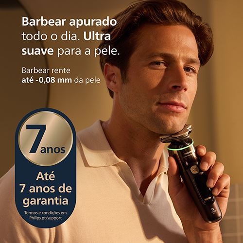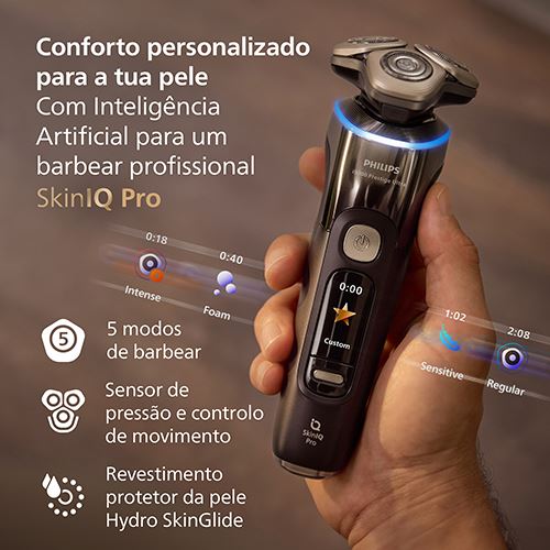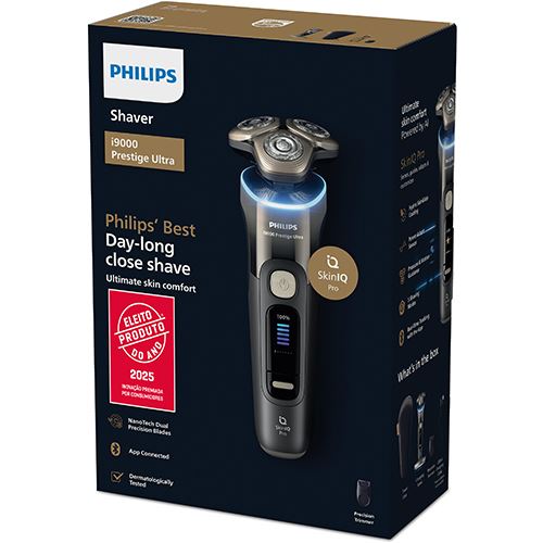 A Philips i9000 Prestige Ultra é a nossa melhor e mais inovadora máquina de barbear, com o exclusivo sistema 'Levanta e Corta' de ação tripla que corta o pelo ao nível da raiz, até -0,08 mm. O resultado é um barbear incrivelmente apurado durante todo o dia, mesmo nas zonas mais difíceis de alcançar. A tecnologia SkinIQ Pro oferece agora 5 modos de barbear para o máximo conforto da pele.