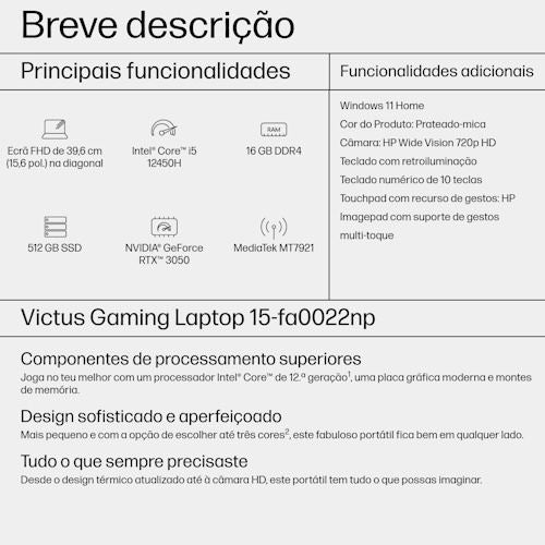 Computador Portátil Gaming Victus by HP 15-fa0022np | 15,6'' | GeForce RTX 3050 | i5-12450H | 16GB | 512GB SSD