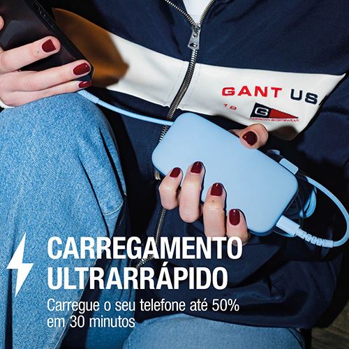 Com uma entrega de energia de 20W, os nossos modelos de 12 000 mAh e de 18 000 mAh carregam os teus aparelhos 2,5 vezes mais rapidamente do que com um powerbank normal. Carregam metade da bateria do teu telemóvel em apenas 30 minutos.* Isto é, são 4 vezes mais rápidos do que um carregador de telemóvel USB-A!