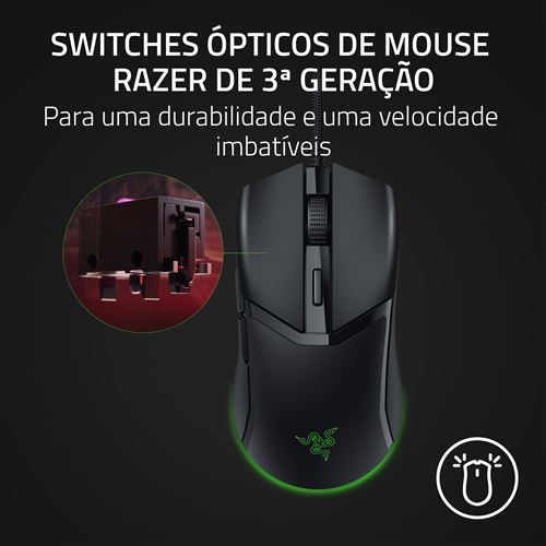 6 controlos programáveis |Comprimento do cabo: 1.8m | Perfil de memória integrado | Cabo Razer Speedflex para movimentos suaves e sem obstáculos | Pes do Rato em PTFE | luminação Chroma com Luz Inferior Grandiente equipada com Razer Chroma RGB | Switches Ópticos Razer de 3ª geração para uma durabilidade e velocidade imbatíveis