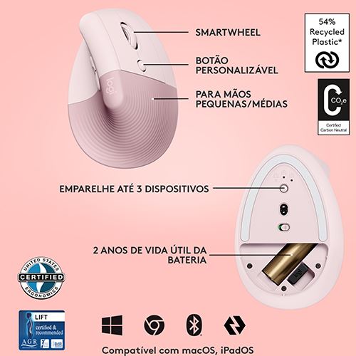 Rato Sem Fio Logitech Ergonómico Vertical Lift Right - Rose