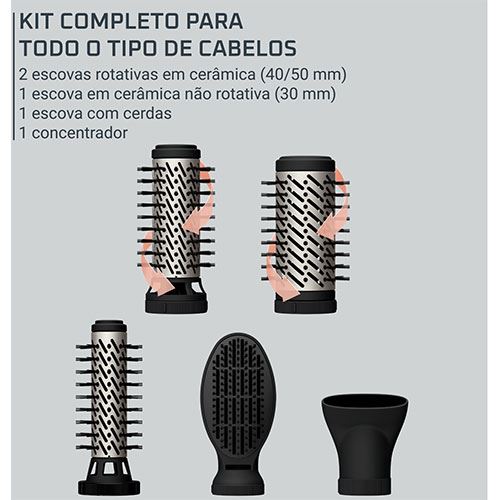CONTEÚDO DA CAIXA: Escova de ar quente rotativa, escova não rotativa de 30 mm (franjas), escova rotativa de 40 mm (secagem glamorosa), escova de 50 mm (secagem natural), concentrador, bolsa de escova de cerdas