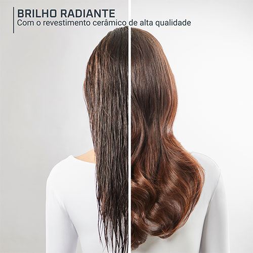 BRILHO RADIANTE: O gerador iónico, as cerdas naturais e o revestimento cerâmico reduzem a eletricidade estática e o frisado para deixar o cabelo mais suave e brilhante