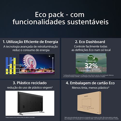 Enquanto desfruta de qualidade superior, contribua para um futuro mais sustentável. Esta TV possui classificação energética F, enquanto no modo HDR apresenta uma classe G. Consome 127,0 kWh em modo SDR e 152,0 kWh em modo HDR por 1.000 horas, equilibrando desempenho de alto nível com compromisso ambiental.