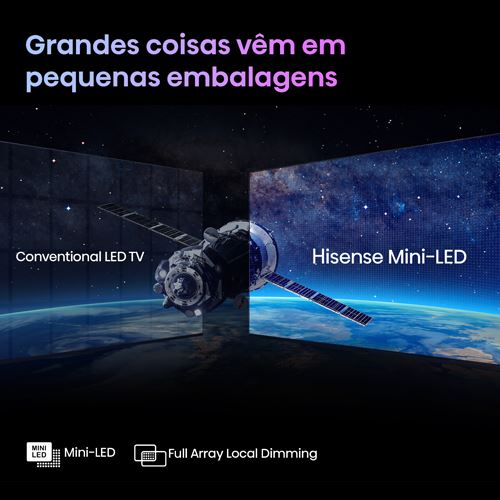 A configuração Mini LED da Hisense melhora estes LEDs, resultando em detalhes de cortar a respiração no ecrã. LEDs agrupados de forma apertada para uma retroiluminação infinitamente mais precisa e um melhor controlo do contraste.