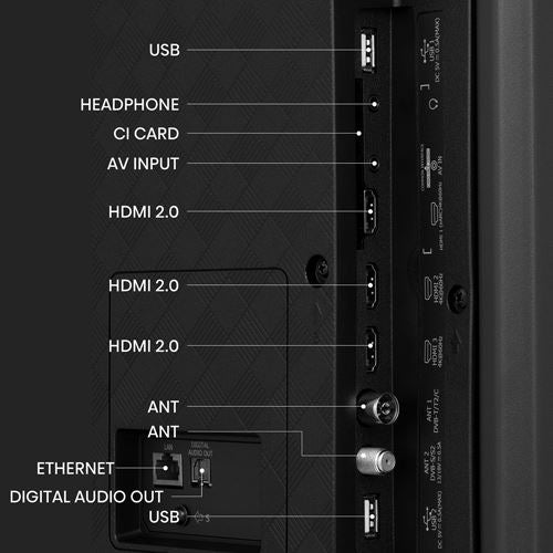 Bluetooth 4.2 | 1x Saída Auscultadores | 1x Saída S/PDIF | 1x Entrada Áudio (L/R) | 1x Common Interface (CI+) | 1x RJ45