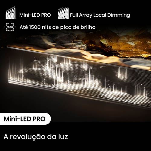 Abrace a elegância da verdadeira escuridão e do brilho estelar. O Mini-LED PRO cria uma intrincada dança de sombras, lançando todas as tonalidades, desde a luz solar intensa até um abismo profundo. As cenas são representadas com destreza, permitindo que o jogo de luz e sombra o cative a cada momento.