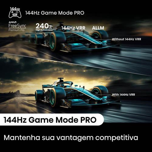 Melhore a sua jogabilidade com o Modo Gaming PRO de 144 Hz, alimentado por uma barra de gaming integrada. Mergulhe em movimentos ultra-fluidos, graças às taxas de atualização variáveis e precisas e à baixa latência MEMC. A 144 Hz, não se trata apenas de jogar; trata-se de conquistar cada fotograma. A vitória nunca foi tão suave.