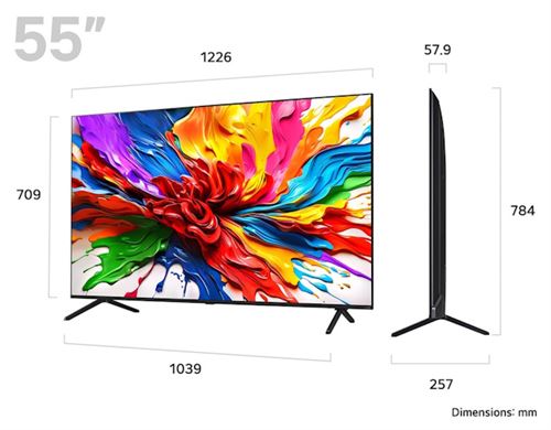 Com uma cor preta elegante, a Smart TV LG 55" complementa qualquer decoração. As suas dimensões, sem base, são de 1226 x 709 x 57,9 mm, e com o suporte VESA compatível de 300 x 300, a instalação na parede ou em suportes torna-se simples e adaptável a qualquer espaço.