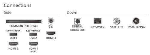 1x Rede LAN RJ45 | 1x Saída Áudio Ótica Digital | 1x Saída Auscultadores 3.5mm | 1x Slot CI+ | Suporte HDMI eARC/VRR/ALLM | Bluetooth v5.2