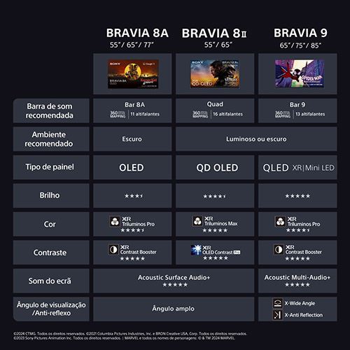 Melhoramento de Imagem XR Triluminos Pro | XR Super Resolução | XR Smoothing | XR OLED Motion | XR Clear Image | Mapeamento Automático de Tons HDR | Tecnologia Live Colour | Otimizador de cor rica | HDR | HDR10 | HLG | Dolby Vision | Otimizado para IMAX