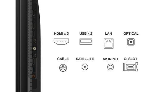 Rede LAN RJ45 | Entradas RF | Saída Áudio Digital Óptica | Saída de Auscultadores | Leitura de ficheiros multimédia via USB | WiFi Direct | Interface CI+ | Bluetooth
