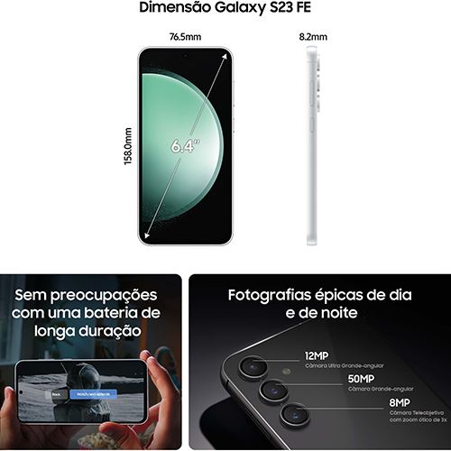 Principal: 50 MP f/1.8, OIS, Dual Pixel AF | Ultra Grande-Angular: 10 MP f/2.2, 123º | Teleobjetiva: 8 MP f/2.4, OIS