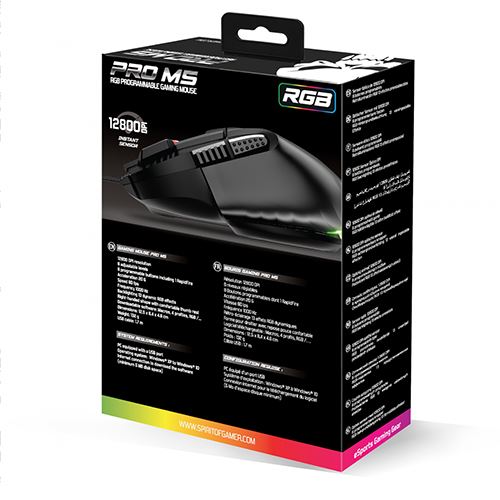 Coloque todas as hipóteses do seu lado com o rato PRO-M5 RGB e o seu sensor ótico instantâneo de alta definição. Com uma resolução lendária ajustável até 12.800 DPI, o PRO-M5 oferece-lhe velocidade e precisão cirúrgica:) personalizando uma das 6 praias de DPI.