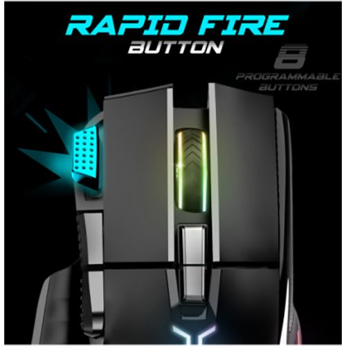 O rato está equipado com 8 botões programáveis, incluindo um botão especial para configurar: FastFire para encadear a matança ou o modo de baixo DPI para atirar sem tremer.