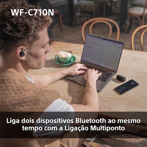 Utilizando Precise Voice Pickup com tecnologia IA, os WF-C710N podem efetuar chamadas de voz nítidas mesmo em ambientes ruidosos. E com a tecnologia de Ligação Multiponto, estes auriculares podem ligar-se a dois dispositivos Bluetooth ao mesmo tempo e alternar facilmente entre eles.