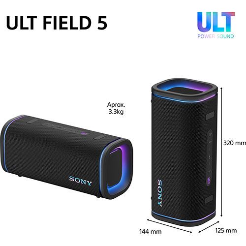 Com base em décadas de experiência da Sony em áudio, a ULT FIELD 5 proporciona um som impactante e envolvente a partir de um design portátil. Um woofer grande e potente junta-se a dois tweeters de grande alcance e elevada qualidade para produzir um áudio impressionante com um impacto gratificante, enquanto os radiadores passivos duplos em ambos os lados melhoram os graves, acrescentando profundidade a cada batida.