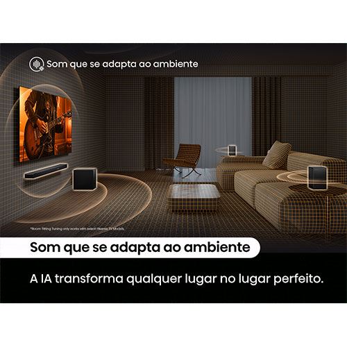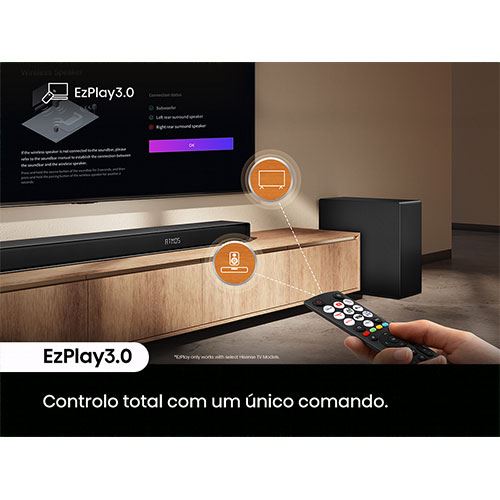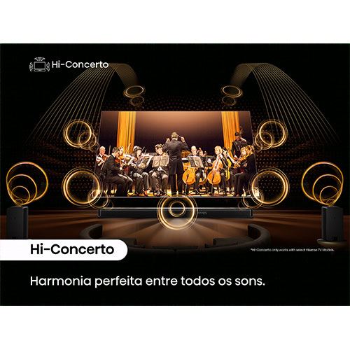 A integração com televisores Hisense através da tecnologia Hi-Concerto permite sincronizar o som da TV com o sistema, ampliando o campo sonoro e melhorando a clareza dos diálogos. A função de calibração automática adapta o som às características da sua sala, garantindo sempre a melhor performance.