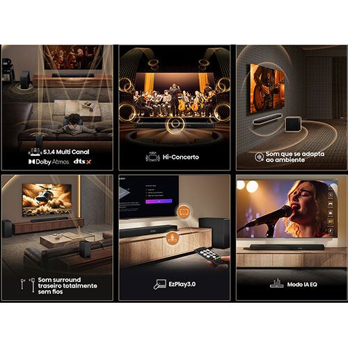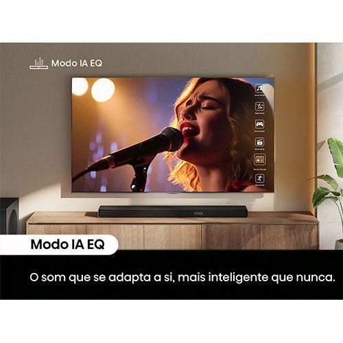 Dolby Atmos | Dolby Digital Plus | Dolby Digital | DTS:X | DTS Virtual: X | Equalizadores: Música, Filmes, Noticias, Jogos, Desporto, Noite, IA | EzPlay1.0/2.0 | Roku TV Ready(RTVR) | Hi-Concert