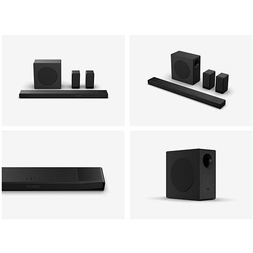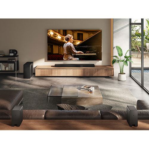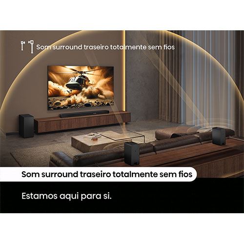 Composta por 13 altifalantes, incluindo drivers verticais na barra e nas colunas traseiras, e um subwoofer sem fios de 6.5”, esta soundbar proporciona graves potentes e realismo acústico impressionante. As colunas traseiras sem fios garantem uma instalação limpa e flexível, sem cabos espalhados pela sala.