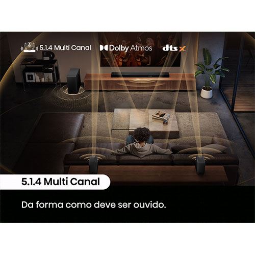 Transforme a sua sala num verdadeiro cinema com a Soundbar Hisense AX5140Q. Este sistema de som 5.1.4 canais oferece uma experiência sonora tridimensional, graças à tecnologia Dolby Atmos® e DTS:X, que cria um ambiente envolvente com som vindo de todas as direções — até de cima.