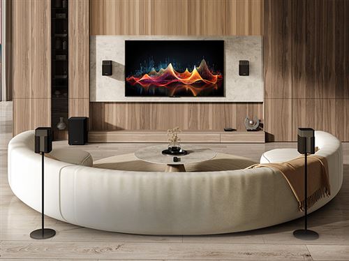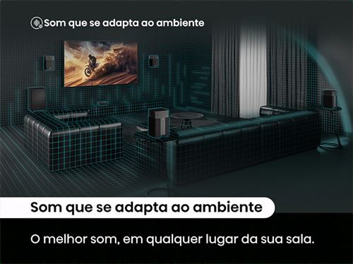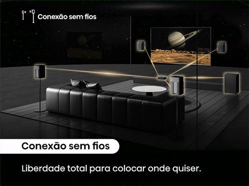 Os canais 4.1.2 proporcionam uma distribuição de áudio que o envolve por completo, transformando qualquer sala na sua casa num verdadeiro cinema pessoal. A inclusão de colunas satélite e subwoofer sem fios dá-lhe a liberdade de criar a configuração de áudio ideal, adaptando-se ao espaço e às suas preferências. Este sistema otimiza a performance acústica de qualquer filme ou transmissão televisiva, melhorando notavelmente a sua experiência de visualização.