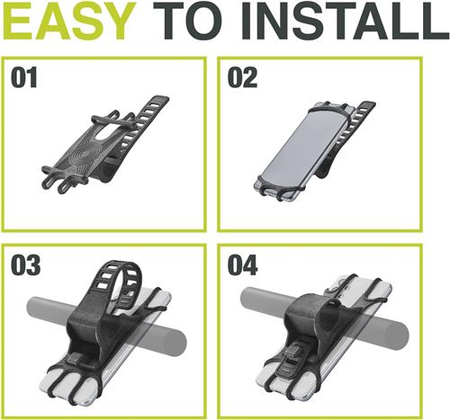Suporte para telemóvel de silicone adequado para guiador de 12 a 32 mm de diâmetro. Seguro e extremamente estável, adapta-se ao guiador graças à lingueta ajustável. Fácil de instalar.
