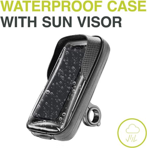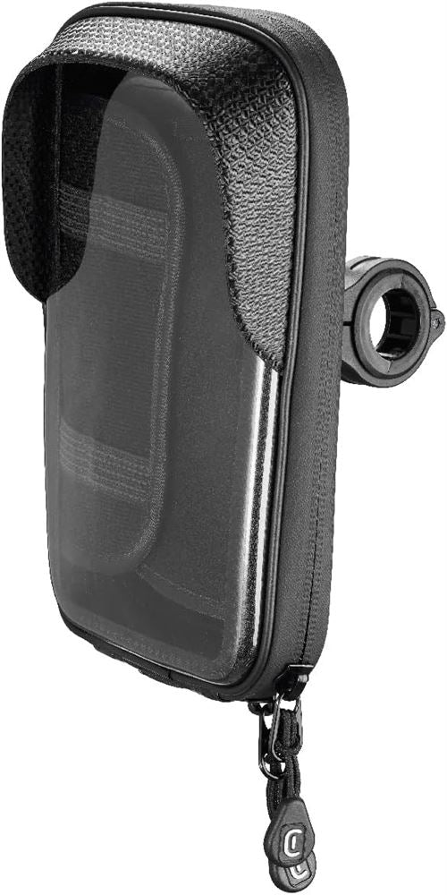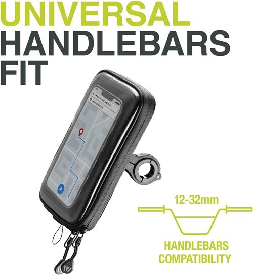 WATERPROOF HOLDER é um suporte com capa para smartphone impermeável para guiador de 12 a 32 mm de diâmetro e adequado para telemóveis de até 6,7 polegadas. O smartphone é colocado dentro da capa que permite usar o ecrã graças ao seu material sensível ao toque. O suporte gira 360°.
