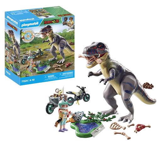 - Divertido set de dinossauros PLAYMOBIL com uma pesquisadora da PLAYMOBIL, um Tyrannosaurus Rex, uma motocicleta com reboque, uma poça com uma pegada, uma lupa, uma câmera, um mapa e equipamento de pesquisa adicional. - O T-Rex tem braços, pernas e cabeça móveis, e uma mandíbula articulada.