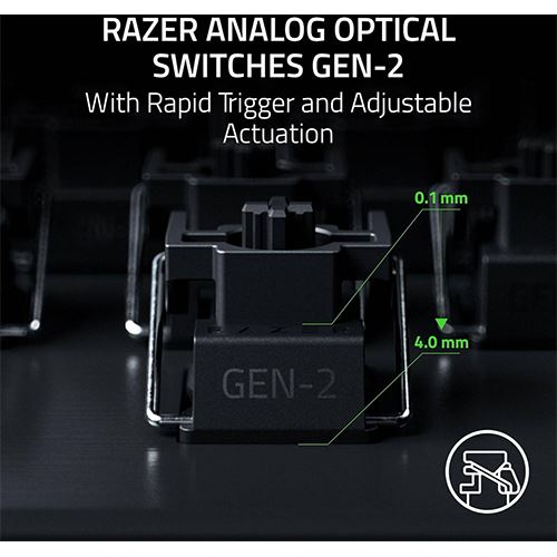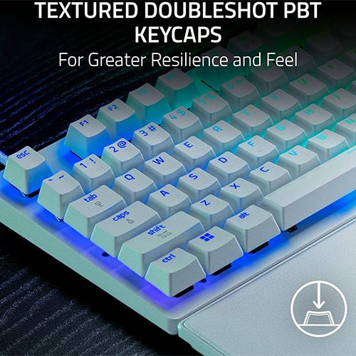 Switches: Razer™ Óptico Analógico Gen-2 | Formato: Tenkeyless | Retroiluminação: Razer™ Chroma RGB | Memória On-board: Armazenamento híbrido integrado para até 6 perfis | Teclas PBT de dupla injeção | N-key Rollover com Anti-ghosting