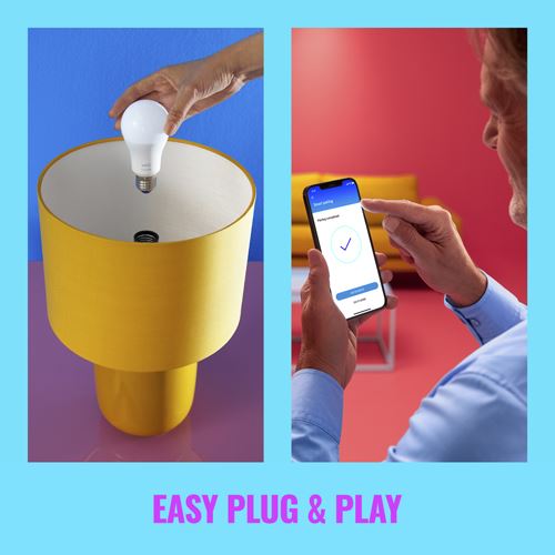 A lâmpada de cor total WiZ LED A60 proporciona uma iluminação inteligente à sua rotina diária. Instale em qualquer abajur para criar o seu ambiente preferido, com 16 milhões de cores e luz branca quente e fria. Pode programar a ativação e desativação das luzes segundo as suas rotinas diárias ou semanais, controlar através do smartphone ou da voz e aceder remotamente às suas luzes mesmo quando está fora de casa. As luzes WiZ são ligadas à sua rede Wi-Fi existente, não é necessário hardware adicional.