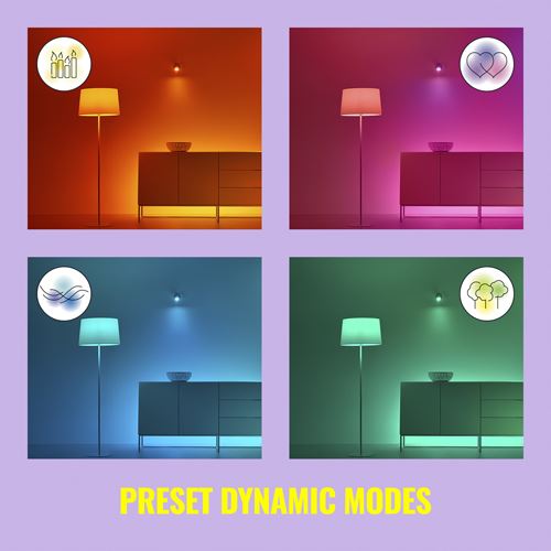 Combine modos de luzes de cores e brancas para criar o ambiente de iluminação perfeito para o seu momento diário especial. Guarde e aceda à configuração sempre que desejar através da aplicação, do comando ou da sua voz.